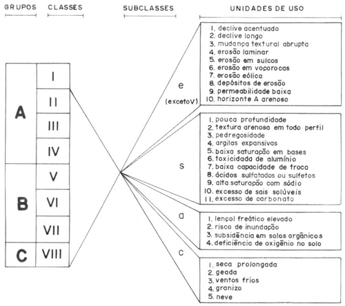 Na hierarquia da classificação existem quatro níveis categóricos divididos em três grupos (A, B, C), oito classes (I, II, III, IV, V, VI, VII e VIII), quatro subclasses: “e” de erosão quanto aos riscos, “s” de solos quanto as limitações, “a” de água quanto aos excessos, “c” de clima com relação as limitações, e diversas unidades de uso. LEPSCH et al (1983) apresentam o esquema das classes, subclasses e unidades de capacidade de uso, conforme a figura 1.