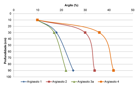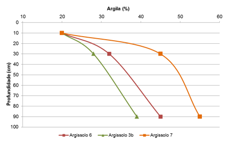 Figura 3. Distribuição de argila nos perfis representativos dos Argissolos.